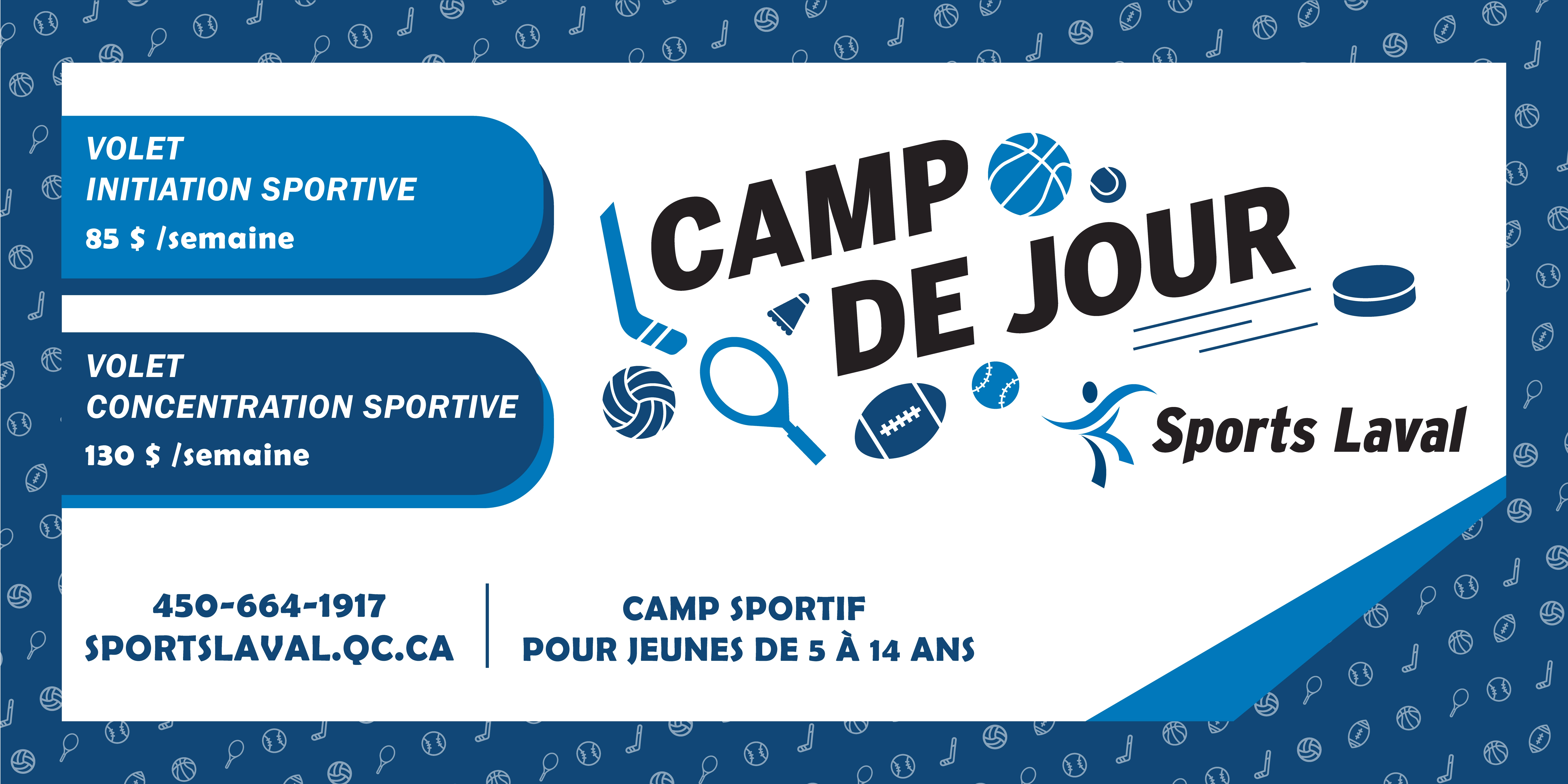 Conception d'un visuel promotionnel grand format pour promouvoir les camps de jour chez Sports Laval. L'organisme souhaitait inclure les tons de bleu déjà utilisés dans son identité graphique (2020)